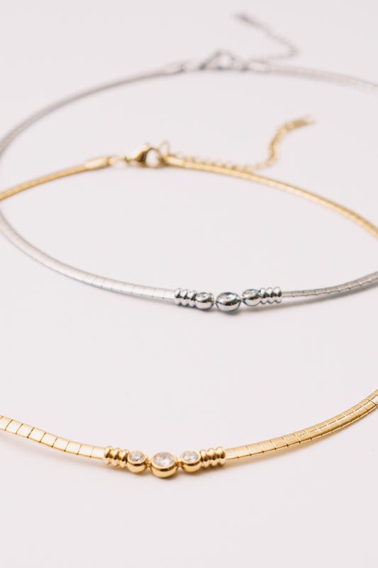 Solin Crystal Omega Necklace | Bezel Set CZ | Gold & Steel | Janna Conner