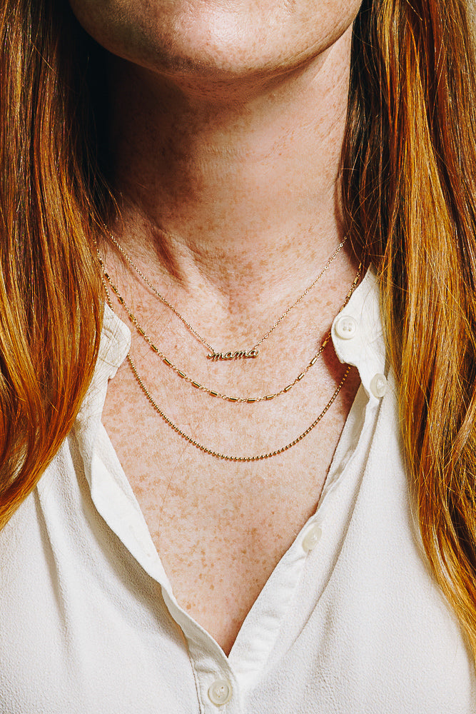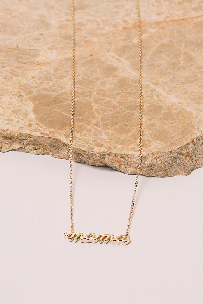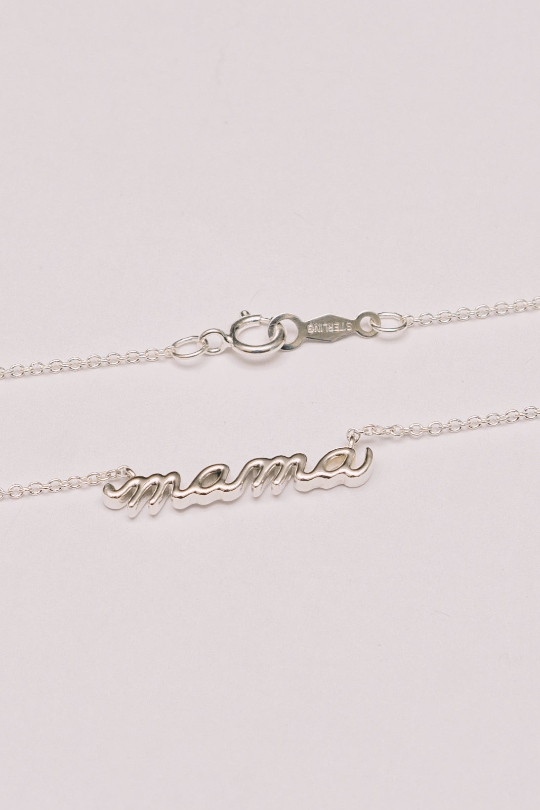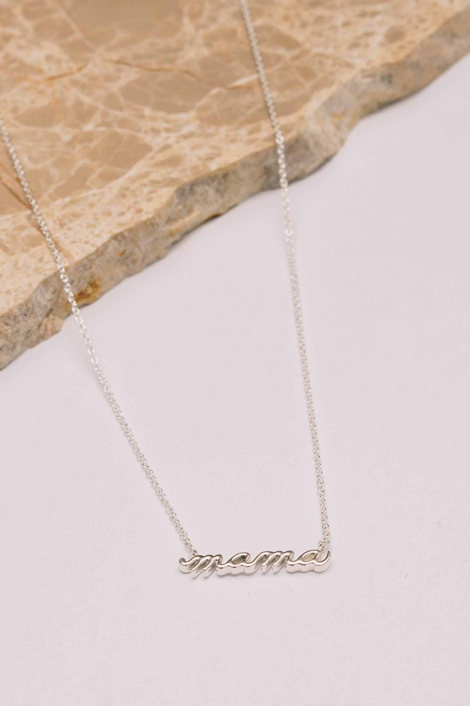 Our petite Mama script necklace is daintily perfect for layering or on its own! Crafted with exquisite detail and precision, this charming necklace adds a touch of elegance to any outfit. The delicate script design beautifully showcases the word 'Mama,' making it an ideal piece for expressing love and appreciation. Whether worn alone for a subtle statement or layered with other pieces, this sterling silver necklace is a timeless and versatile accessory. Elevate your style and celebrate motherhood with this tastefully crafted piece